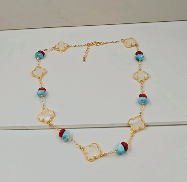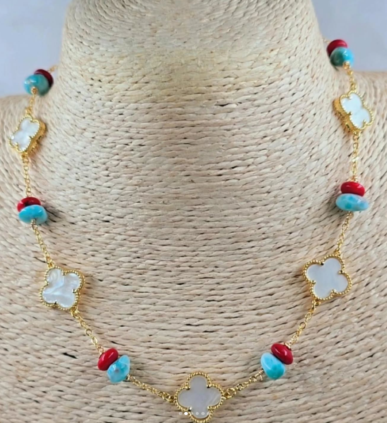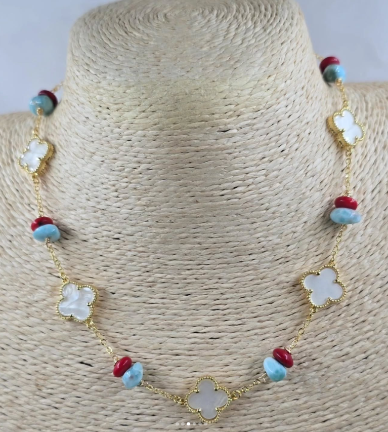 Esta obra maestra combina de manera impecable larimar, coral y nácar, creando un diseño elegante y lleno de significado.